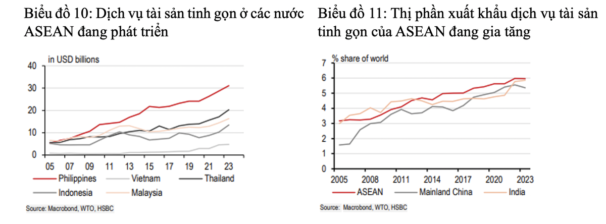 Theo HSBC, tính gộp chung lại, thị phần dịch vụ tài sản tinh gọn toàn cầu của ASEAN đã gần như gấp đôi, từ 3,2% vào năm 2005 lên 6% ở thời điểm hiện tại. Con số này cao hơn thị phần của Ấn Độ hoặc Trung Quốc đại lục vốn cũng chứng kiến thị phần dịch vụ tài sản tinh gọn gia tăng với quy mô lớn mạnh của hai quốc gia này.