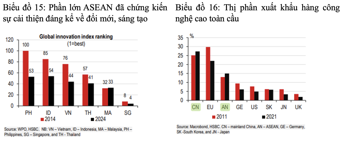 Đáng chú ý, thứ hạng của mỗi nền kinh tế ASEAN trên bảng xếp hạng Chỉ số đổi mới sáng tạo toàn cầu (Global Innovation Index) năm 2014 và 2024. Ngoại trừ Malaysia, tất cả các nền kinh tế ASEAN đều có thứ hạng cải thiện đáng kể, trong đó, Singapore là nền kinh tế có mức độ đổi mới, sáng tạo cao thứ tư thế giới. Kết quả này cũng được phản ánh trong thị phần hàng sản xuất công nghệ cao toàn cầu.