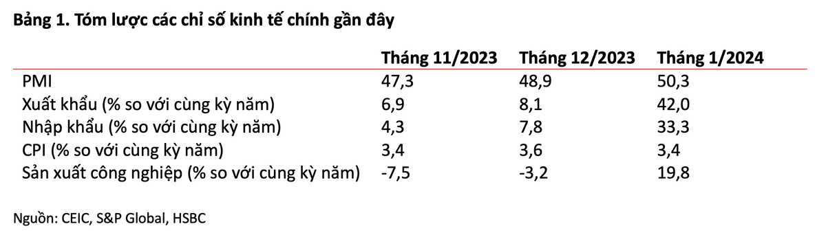 Theo Báo cáo, trong bối cảnh Tết Nguyên đán sắp đến vào giữa tháng 2/2024, các chuyên gia của HSBC cần diễn giải dữ liệu tháng 1 một cách thận trọng. Mặc dù vậy, mặc dù chịu tác động bởi hiệu ứng cơ sở, rõ ràng thương mại của Việt Nam vẫn tiếp tục vững vàng trên đà phục hồi. Xuất khẩu tăng với tốc độ kinh ngạc là 42,0% so với cùng kỳ năm trước, nhờ phục hồi ổn định trong xuất khẩu hàng điện tử. Sắp tới, số lượng đặt hàng trước dòng điện thoại Samsung Galaxy S24 mới ở mức cao cũng phần nào giúp tình hình thêm lạc quan.