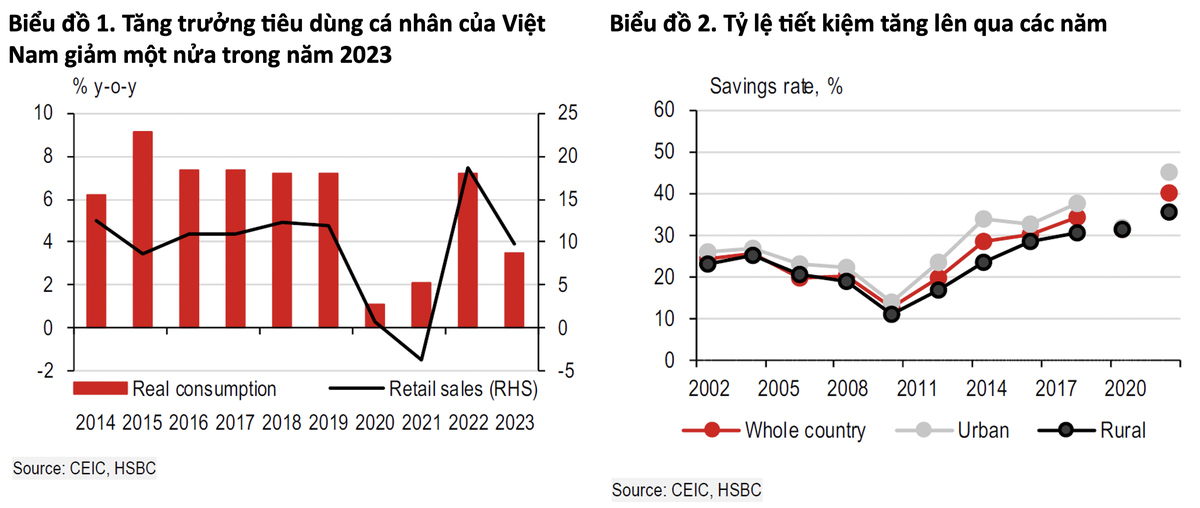 Trên thực tế, Việt Nam có tỷ trọng tiêu dùng lớn chiếm hơn 50% GDP. Gia tăng với tốc độ bình quân hàng năm là 7,5% trước đại dịch, tiêu dùng cá nhân đã giảm sút đáng kể từ khi xảy ra dịch bệnh, ngoại trừ giai đoạn mở cửa trở lại trong năm 2022. Đặc biệt, tăng trưởng tiêu dùng cá nhân đã giảm một nửa trong năm 2023, phản ánh tác động rõ rệt của tình hình kinh tế chậm lại đối với các hộ gia đình.