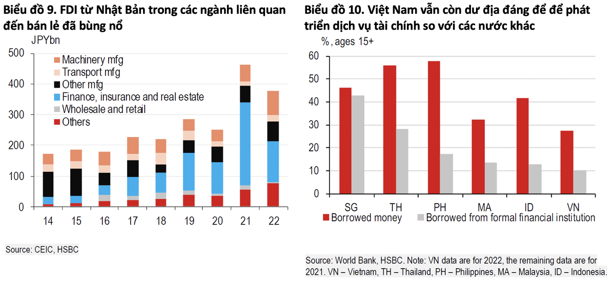 Báo cáo cho biết, bất chấp những thách thức mang tính chu kỳ trong ngắn hạn, chúng tôi tin rằng những xu hướng cơ cấu còn tiếp tục hứa hẹn đối với Việt Nam. Với sự phát triển ấn tượng trong vòng 20 năm qua, sự gia tăng nói chung về tài sản đã thúc đẩy xu hướng tiêu dùng mạnh hơn, kích thích sự chuyển dịch sang hàng hóa và dịch vụ không thiết yếu. Sự gia tăng của tầng lớp trung lưu mới nổi đã thu hút sự chú ý của các doanh nghiệp quốc tế tìm kiếm cơ hội sinh lời nhờ nhu cầu gia tăng chi tiêu của người Việt Nam. Dòng FDI từ Nhật Bản đổ vào lĩnh vực bán lẻ và dịch vụ tài chính đã tăng mạnh chính là một ví dụ đáng chú ý.
