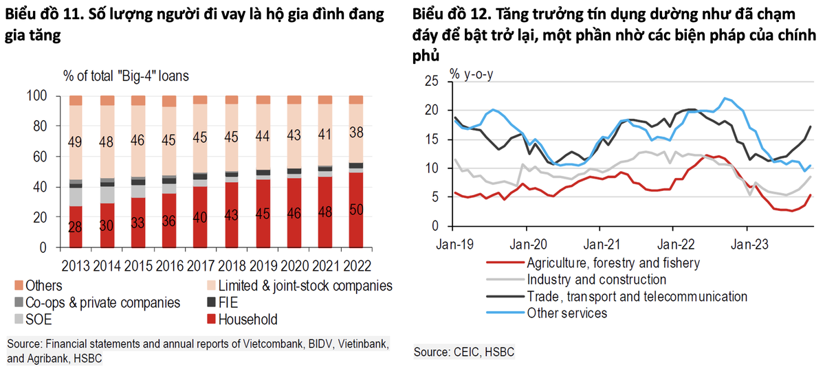 “Điều may mắn là chính phủ đã triển khai một loạt các biện pháp hỗ trợ cho cả doanh nghiệp và hộ gia đình trong năm 2023, chẳng hạn như gia hạn thời gian giảm thuế, cắt giảm lãi suất và gia hạn thời gian trả nợ. Trong khi những căng thẳng tài chính có khả năng còn duy trì và sẽ cần được theo dõi trong giai đoạn ngắn hạn, có một số dấu hiệu cho thấy giai đoạn xấu nhất đã trôi qua. Theo quan điểm của chúng tôi, tâm lý còn thận trọng nhưng đang cải thiện đối với lĩnh vực bất động sản sẽ thúc đẩy tâm lý người tiêu dùng nói chung. Trong khi đó, triển vọng tốt lên của thị trường lao động sẽ hỗ trợ tăng trưởng lương, từ đó cải thiện khả năng trả nợ của hộ gia đình”, HSBC nhận định.