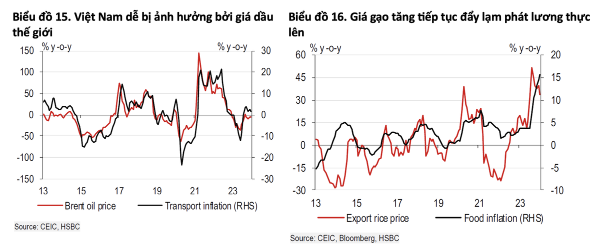 Bên cạnh năng lượng, giá thực phẩm tiếp tục cần đặt trong tầm ngắm, đặc biệt là do những diễn biến của hiện tượng El Niño ở Đông Nam Á. Như chúng tôi từng nói, giá gạo trong nước của Việt Nam đã tăng cùng với giá gạo thế giới, đẩy lạm phát gạo lên. Mặc dù gạo chỉ chiếm một tỷ trọng nhỏ trong rổ hàng hóa tính Chỉ số Giá tiêu dùng (CPI) của Việt Nam (chưa tới 3,7%) và giá thịt heo tiếp tục giúp kiểm soát lạm phát thực phẩm, thực phẩm thiết yếu cũng là một điểm quan trọng đối với dự báo lạm phát.