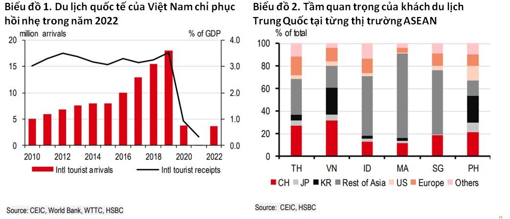 Theo HSBC, sau khi mở cửa trở lại vào tháng 3 năm ngoái, du lịch nội địa đã phục hồi mạnh mẽ, giúp Việt Nam dễ dàng vượt qua mục tiêu 60 triệu lượt khách nội địa trong năm 2022 và thực tế đạt được trên 100 triệu lượt khách du lịch nội địa. Đồng thời, Việt Nam đón 3,6 triệu lượt khách du lịch quốc tế, chủ yếu là du khách đến từ Hàn Quốc (26%) và Mỹ (9%).