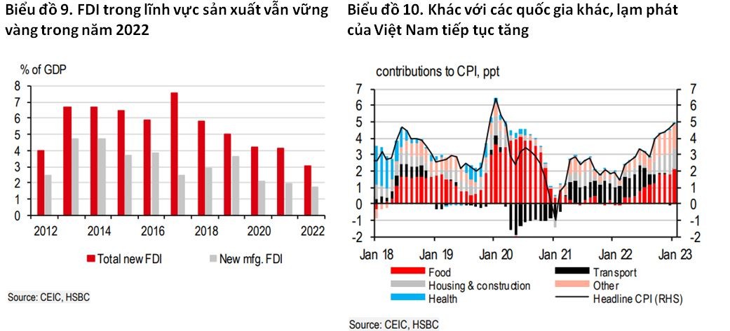Mặc dù vậy, HSBC cho rằng, Việt Nam khởi đầu năm 2023 với dòng vốn FDI mới khả quan là 1,2 tỷ USD. Bất chấp chu kỳ đi xuống của công nghệ toàn cầu trong ngắn hạn, các công ty công nghệ tiếp tục đầu tư vào Việt Nam. Thực tế, dù tổng FDI sụt giảm trong năm 2022, FDI trong lĩnh vực sản xuất vẫn vững vàng, càng nêu bật lợi thế cạnh tranh của Việt Nam trong mảng này.