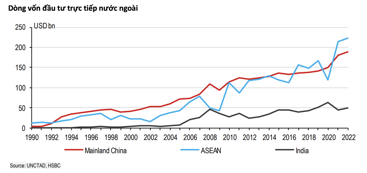 Đồng thời, dòng vốn chảy vào Ấn Độ cũng đang có xu hướng tăng lên, nhưng xét về tổng thể thì vẫn còn thấp hơn nhiều”, các chuyên gia kinh tế của HSBC nhận định.