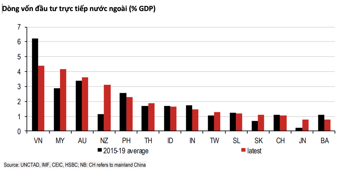 “Tương quan tầm quan trọng của FDI trên toàn khu vực. Tại Việt Nam, Malaysia, New Zealand, Úc và Philippines, dòng vốn FDI chiếm hơn 2% GDP. Ngược lại, ở Hàn Quốc, Nhật Bản, Trung Quốc đại lục và Bangladesh, dòng vốn FDI chiếm khoảng 1% GDP hoặc ít hơn. Bức tranh tổng thể không thể hiện sự suy giảm, có lẽ nói đúng hơn là có sự dịch chuyển nhưng dòng vốn FDI nói chung vẫn duy trì ổn định bền vững”, HSBC nhận định.