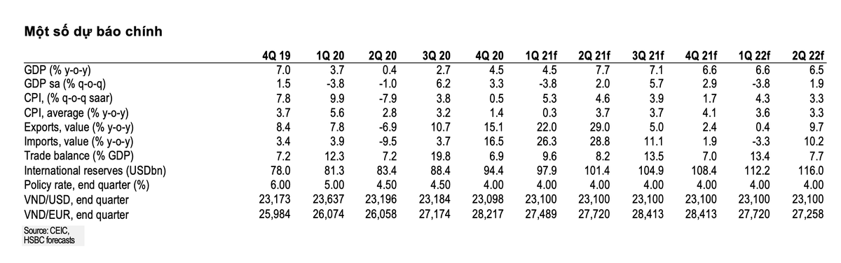 Nhìn chung, Khối Nghiên cứu Kinh tế của Ngân hàng HSBC vừa điều chỉnh giảm tăng trưởng năm 2021 của Việt Nam xuống còn 6,6%, cho thấy mức độ phục hồi của quý I/2021 kém hơn dự kiến.