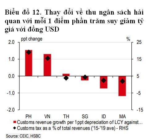 Trong khi đó, HSBC cho biết, quan hệ tương quan như vậy không xảy ra với trường hợp tỷ giá đồng nội tệ với USD. Biểu đồ trên cho thấy thay đổi bình quân trong thu ngân sách hải quan (thuế xuất nhập khẩu) với mỗi 1 điểm phần trăm suy giảm tỷ giá với đồng bạc xanh. Với Philippines và Việt Nam, hai nền kinh tế có thu ngân sách hải quan chiếm tỷ trọng lớn trong thu ngân sách, đồng nội tệ giảm giá có thể tạo ra một nguồn thu ngân sách đáng kể.