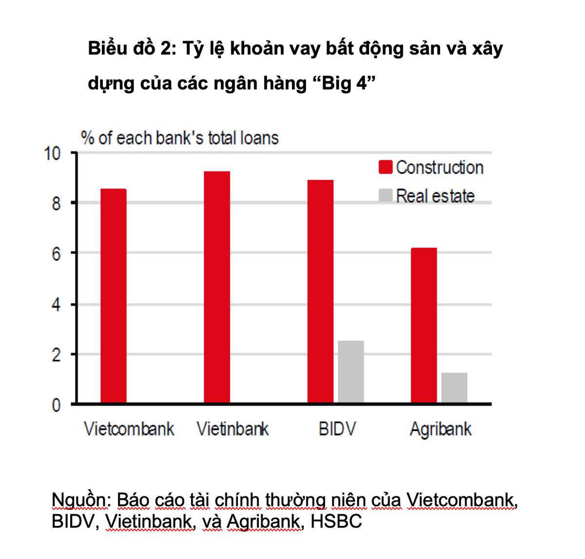 Trong khi một số ngân hàng không phân định rõ các khoản vay bất động sản, báo cáo tài chính của nhóm ngân hàng thương mại nhà nước “Big 4” cho thấy mối liên hệ với một ngành liên quan trực tiếp là xây dựng (Biểu đồ 2).
