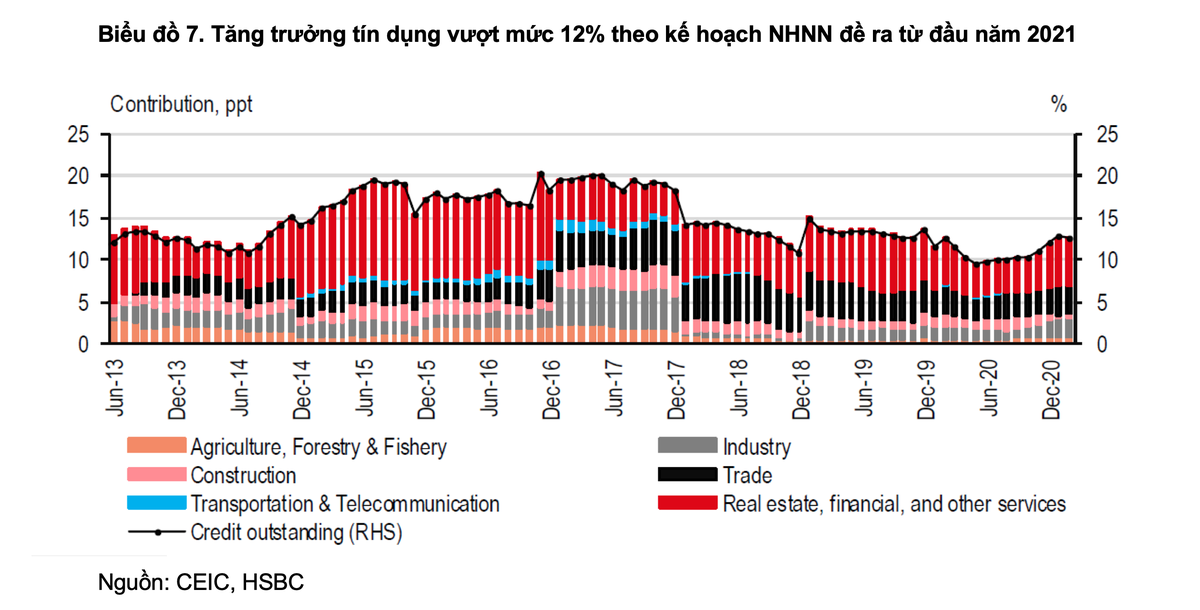 Dù vậy, NHNN cũng đang phải thận trọng cân bằng giữa việc hạn chế tín dụng đổ vào bất động sản với nỗ lực giảm thiểu rủi ro trước mắt do Covid-19 đối với ngành này. HSBC cho rằng, đây vẫn là một nguồn đóng góp ngày càng nhiều cho tăng trưởng chung.