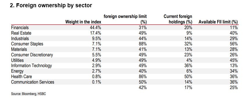 HSBC cho rằng, điều này có nghĩa là khi nhà đầu tư nước ngoài đã mua đủ 50% cổ phần của một công ty, họ chỉ có thể giao dịch với những nhà đầu tư nước ngoài khác. Từ đó hình thành một mức giá dành riêng cho nhà đầu tư nước ngoài, khác với giá dành cho nhà đầu tư trong nước. Mặc dù đây không hẳn là một yêu cầu bắt buộc để FTSE nâng hạng, nhưng có thể là vấn đề mà nhà đầu tư quan tâm và nêu ra.