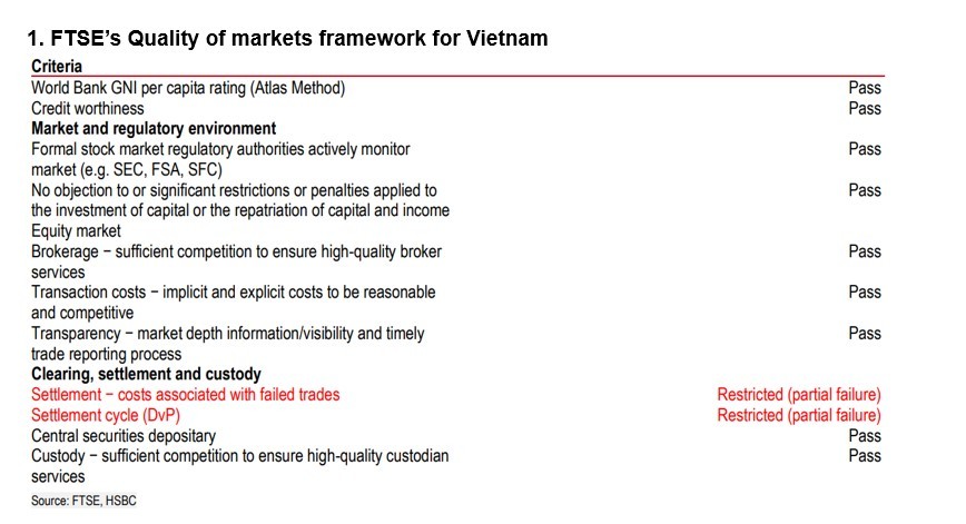Trong cập nhật mới nhất, FTSE thừa nhận Việt Nam hiện đã đáp ứng 7/9 tiêu chí cần thiết. Những tiến bộ nổi bật ở 2 tiêu chí còn lại đã củng cố cơ hội nâng hạng. Báo cáo của HSBC cho rằng, điều này đưa Việt Nam tiến gần hơn tới thị trường mới nổi, nhưng cũng lưu ý rằng FTSE cũng sẽ tham khảo ý kiến nhà đầu tư và công ty chứng khoán trước khi quyết định.