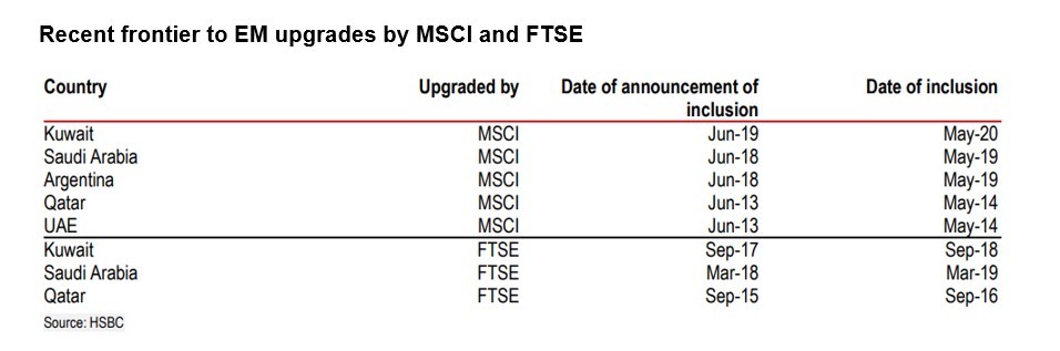 Ả Rập Xê Út và Kuwait là hai thị trường mới nhất được FTSE nâng hạng từ cận biên lên mới nổi. Trong 6 tháng trước khi có thông báo chính thức về việc được thêm vào chỉ số, diễn biến thị trường của họ nhìn chung khá ổn định, gần như đi ngang.