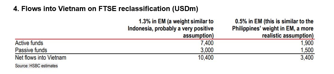 Nếu Việt Nam được nâng hạng lên EM với quy mô vốn hóa hiện tại (vẫn ở mức thị trường cận biên), tỷ trọng của Việt Nam sẽ khoảng 0,6% trong FTSE Asia và 0,5% trong FTSE EM. Khi đó, dự kiến 1,5 tỷ USD vốn ngoại sẽ chảy vào TTCK Việt Nam thông qua các quỹ thụ động, chủ yếu từ quỹ tham chiếu FTSE EM và FTSE Global ex US.