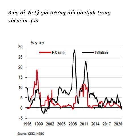 Ngoài các yếu tố cung và cầu, tỷ giá hối đoái cũng là một yếu tố khác có ảnh hưởng trực tiếp đến tình hình lạm phát. Tuy nhiên, theo HSBC, tác động của tỷ giá tới lạm phát của Việt Nam dường như không có, vì sự ổn định tỷ giá.