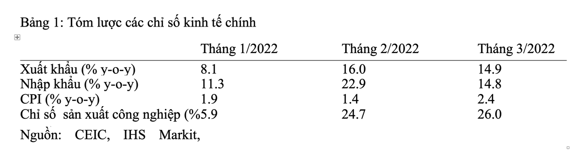 Mặc dù xuất khẩu phục hồi mạnh mẽ, thặng dư thương mại của Việt Nam trong quý I/2022 thu hẹp xuống mức tối thiểu 0,8 tỷ USD. Kết quả này không ngoài tầm dự đoán vì bản chất lĩnh vực sản xuất của Việt Nam luôn cần phải nhập khẩu nhiều. Thực tế, nhập khẩu tăng 16% so với cùng kỳ năm trước và một nửa trong số đó là linh kiện điện tử. Tuy nhiên, trong bối cảnh thiếu hụt nhiên liệu, giá nhiên liệu tăng cao là vấn đề thu hút sự quan tâm.