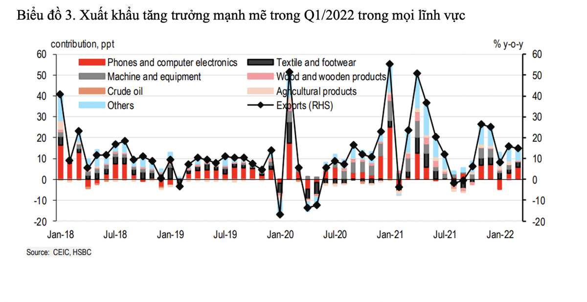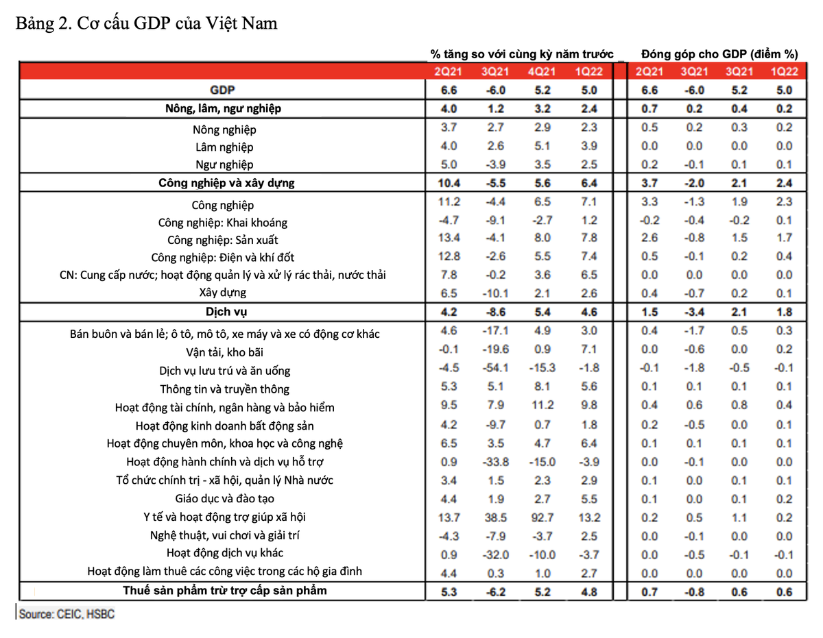 HSBC cho biết thêm, mức tăng GDP trong quý I/2022 cao hơn mức kỳ vọng 4,7% được đưa ra trước đó và thấp hơn chút so với mức dự báo chung của thị trường 5,5%. Trong năm 2021, Việt Nam đã ghi nhận mức tăng trưởng thấp nhất trong vòng 30 năm.