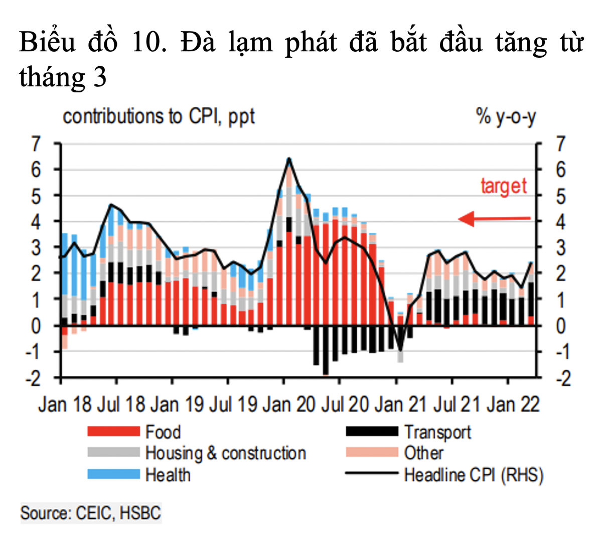 Theo các chuyên gia của HSBC, mức lạm phát này của Việt Nam về cơ bản vẫn trong tầm kiểm soát so với các thị trường mới nổi khác, xét bối cảnh giá thực phẩm và áp lực giá do nhu cầu về cơ bản đã được kiểm soát.