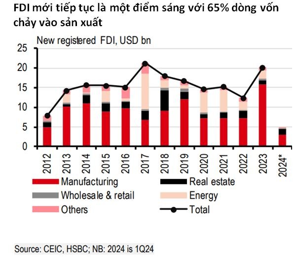 Trong khi thương mại ngắn hạn sẽ sớm cất cánh, triển vọng dài hạn của FDI tiếp tục là một điểm sáng. Vốn FDI đầu tư mới trong quý I/2024 tăng gần 60% so với cùng kỳ năm trước, 65% trong số đó tập trung vào lĩnh vực trụ cột là sản xuất, phần còn lại rót vào bất động sản. Khi xem xét nơi xuất phát của vốn đầu tư, HSBC cho biết, điểm thú vị là Singapore đã giành ngôi vương là nước cung cấp FDI lớn nhất vào Việt Nam, với tỷ lệ ấn tượng là 50%. Khu vực Trung Quốc, Hồng Kông, Đài Loan, Macau từng chiếm một nửa FDI của Việt Nam trong năm 2023, nay chỉ còn chiếm tổng cộng 15%.