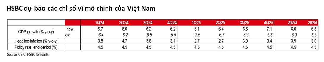 Nhìn chung, HSBC tin rằng Việt Nam đang đi đúng hướng để chứng kiến triển vọng tăng trưởng tốt hơn trong năm 2024 dù sẽ cần thời gian để sự phục hồi lan tỏa rộng khắp. HSBC giữ nguyên dự báo tăng trưởng GDP 6,0% cho năm nay nhưng điều chỉnh dự báo theo quý với kỳ vọng sự phục hồi sẽ lan rộng hơn nữa trong sáu tháng cuối năm 2024.