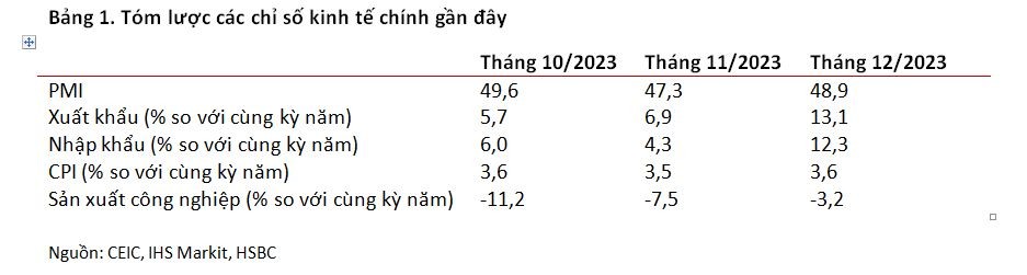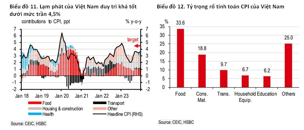 Mặt khác, lạm phát vẫn là vấn đề đáng lưu tâm. Năm 2023, lạm phát của Việt Nam vẫn nằm trong mức kiểm soát, bình quân ở mức 3,3%, phù hợp với dự báo của HSBC. Trong năm 2024, HSBC kỳ vọng lạm phát sẽ tiếp tục duy trì ở mức nhẹ, dự báo ở mức 3,4%, thấp hơn nhiều so với mục tiêu lạm phát mới là 4-4,5%. Mặc dù xu hướng giảm lạm phát diễn ra trên diện rộng ở Việt Nam, áp lực giá vẫn chưa hoàn toàn mất đi.