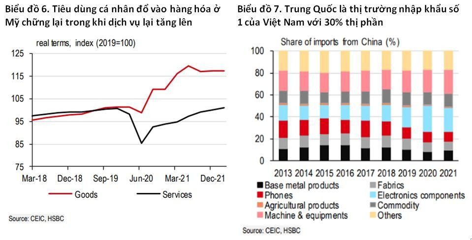 Bên cạnh xuất khẩu, Việt Nam tiếp tục hưởng lợi nhờ chiến lược mở cửa diện rộng. Tháng 4 chứng kiến một số lượng lớn khách du lịch trở lại Việt Nam trong khi tiêu dùng của hộ gia đình tiếp tục phục hồi. Mặc dù giá dầu vẫn tăng, lạm phát tháng 4 ở mức 2,6% vẫn tương đối thấp. HSBC dự báo lạm phát Việt Nam sẽ tăng lên 3,7% trong năm 2022, vẫn trong ngưỡng lạm phát trần 4% của Ngân hàng Nhà nước Việt Nam.