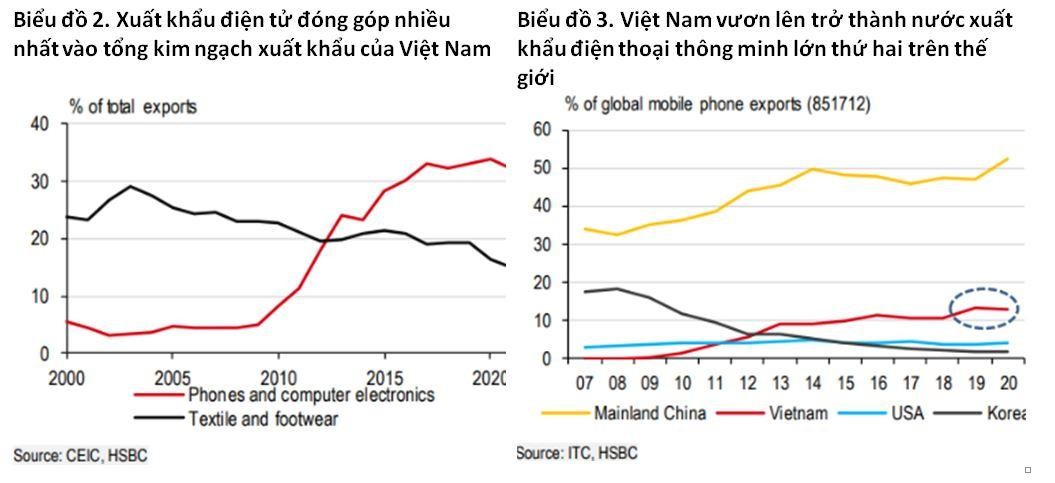 Theo HSBC, với xuất phát điểm chỉ là một nước xuất khẩu hàng may mặc và da giày có giá trị cộng thêm thấp, qua thời gian, Việt Nam đã chứng tỏ khả năng vươn lên trong chuỗi cung ứng, trở thành một trung tâm sản xuất quan trọng trong ngành hàng công nghệ (mặc dù giá trị cộng thêm vẫn chưa cao trong lĩnh vực điện tử).