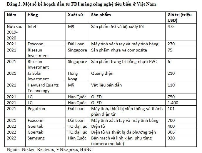 Điểm đáng lưu ý, theo HSBC chính là hiệu ứng dây chuyền xảy ra khi thành công của Samsung và Intel kéo theo các tập đoàn công nghệ khổng lồ khác cũng đẩy nhanh quá trình chuyển hướng chuỗi cung ứng sang Việt Nam. Mặc dù đại dịch đã phần nào khiến quá trình này bị gián đoạn, sự quan tâm của các nhà đầu tư FDI trong lĩnh vực công nghệ vẫn duy trì mạnh mẽ nhờ các yếu tố vĩ mô ổn định, chính sách FDI thuận lợi và hiệu quả về chi phí nhân công.