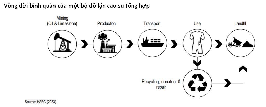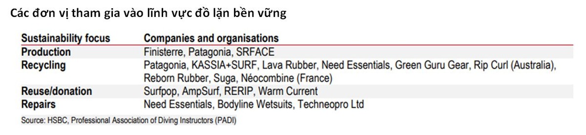 "Quá trình này giảm 80% lượng phát thải CO2 so với cao su tổng hợp. Tuy nhiên, khi những sản phẩm có nguồn gốc thực vật ngày càng phổ biến, chúng ta phải thận trọng trước tác động của tình trạng phá rừng. Các công ty và tổ chức đang nỗ lực kéo dài tuổi thọ của đồ lặn và phát triển các vật liệu thay thế", HSBC cho biết.