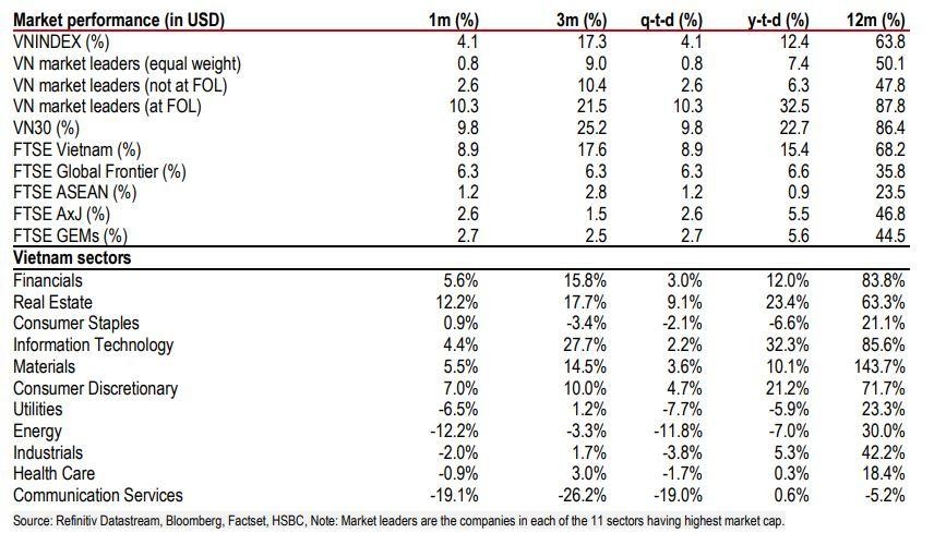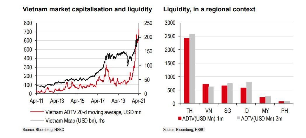 Theo HSBC, doanh thu thị trường Việt Nam hiện nay gần như ngang bằng với Singapore và vượt trội so với Malaysia và Indonesia. Tính đến hết tháng 4, chỉ số VN-Index đã tăng 12,4% so với thời điểm đầu năm, vượt qua tất cả các chỉ số chính trong khu vực và lần đầu tiên đã vượt qua ngưỡng kháng cự tâm lý 1.200 điểm, mức chưa từng được phá vỡ kể cả trong các thời điểm tăng giá của thị trường trước đó vào năm 2007 và 2018.