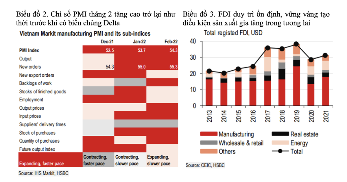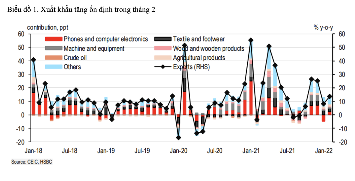 HSBC cho rằng, trong bối cảnh giá dầu tăng cao, thương mại của Việt Nam đã bị tác động. Trong khi hiệu ứng cơ sở và ngành hàng điện tử thường xuyên cần nhập khẩu là những nguyên nhân chính phía sau tăng trưởng nhập khẩu mạnh mẽ, nhập khẩu xăng dầu trong tháng 2 tăng gần gấp đôi mức trung bình một tháng của năm 2021. Xu hướng này nhiều khả năng sẽ tiếp diễn khi Bộ Công thương ban hành Quyết định về việc giao sản lượng nhập khẩu xăng dầu tăng thêm 2,4 triệu m3 trong quý III/2022.