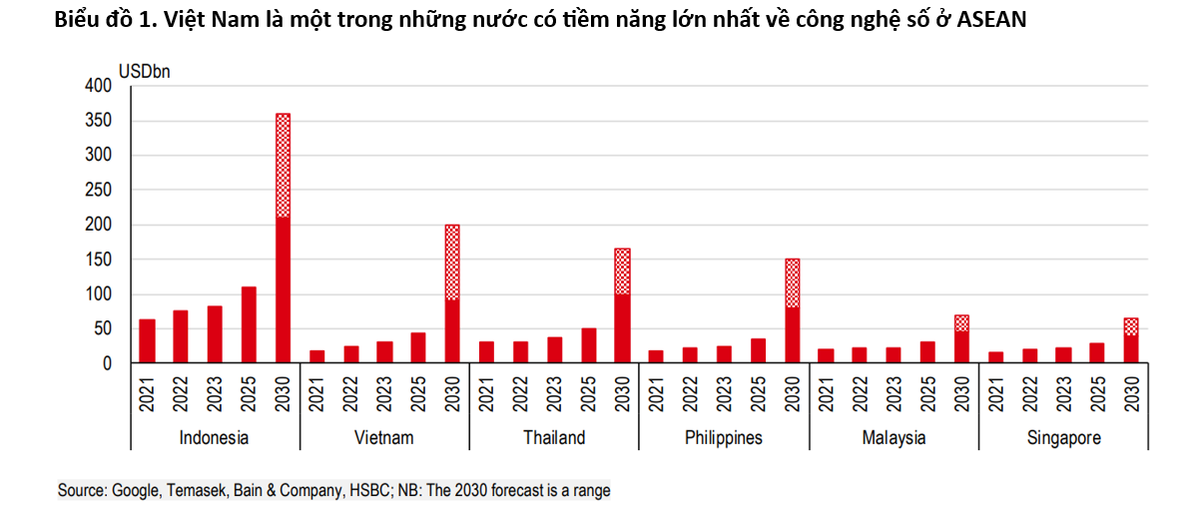 Theo HSBC, sự sôi động trong đầu tư liên quan đến công nghệ số đang diễn ra ở Đông Nam Á. Mới đây, Microsoft công bố nhiều khoản đầu tư tại Indonesia, Malaysia và Thái Lan; còn tại Việt Nam, Alibaba dự định xây một trung tâm dữ liệu nhằm đáp ứng nhu cầu gia tăng về công nghệ số.