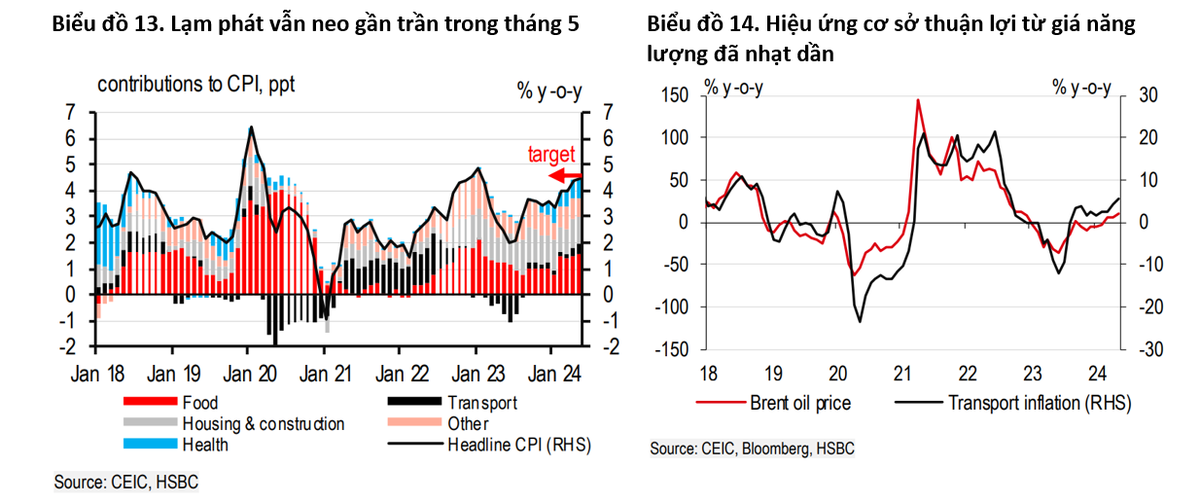 Ngoài ra, HSBC nhận định, lạm phát đòi hỏi giám sát chặt chẽ trong ngắn hạn. Lạm phát chính trong tháng 5 neo ở mức 4,4% so với cùng kỳ năm trước, gần chạm đến trần 4,5% của Ngân hàng Nhà nước.