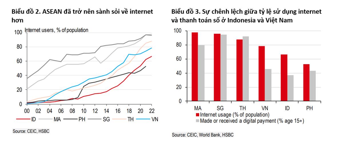 “Không chỉ có thuận lợi về nhân khẩu học, sự gia tăng nhanh chóng số lượng người dùng internet của Việt Nam cũng giúp mở rộng thị trường công nghệ số. Hiện nay, Việt Nam có gần 80% dân số sử dụng internet nhờ tỷ lệ sở hữu điện thoại thông minh đã tăng hơn gấp đôi so với cách đây một thập kỷ. Tuy nhiên, dù số lượng người dùng internet tăng trưởng đáng kể, mức độ ứng dụng công nghệ số trong một số lĩnh vực lại chậm lại phía sau”, HSBC nhận định.