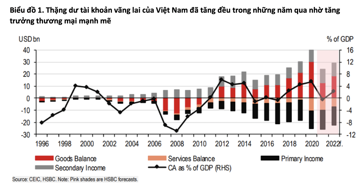 Năm 2020, HSBC từng nhấn mạnh khả năng chống chịu trước các cú sốc bên ngoài của Việt Nam ngày càng tốt lên theo thời gian. Mặc dù vậy, do bối cảnh thay đổi, đây là lúc đánh giá lại tình hình tài khoản vãng lai của Việt Nam.