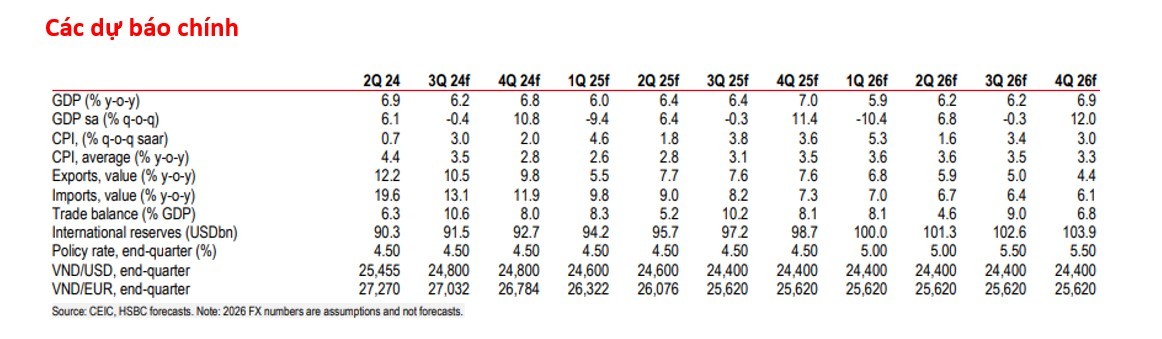 Các chuyên gia của HSBC cũng tin rằng những khả năng tích cực tiềm tàng có thể bù đắp cho tổn thất kinh tế tạm thời do siêu bão Yagi gây ra. Theo đó, HSBC vẫn giữ dự báo tăng trưởng GDP cho cả năm 2024 và 2025 ở mức 6,5%.