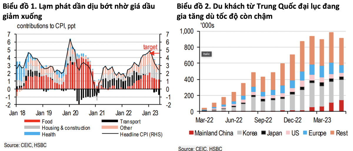 HSBC tính toán, Việt Nam đã đón tổng cộng 4,6 triệu du khách quốc tế từ đầu năm tới nay, đạt 60% mục tiêu 8 triệu du khách quốc tế của năm 2023. Với mùa du lịch hè sắp tới và khả năng nới lỏng các hạn chế về thị thực, vốn đang được Quốc hội cân nhắc, Việt Nam có thể sẽ chứng kiến một cú hích mạnh hơn từ du lịch quốc tế, một nguồn hỗ trợ rất cần thiết đối với nền kinh tế đang chững lại hiện nay. Đề xuất bao gồm kéo dài thời hạn thị thực điện tử (từ 30 ngày) lên 90 ngày và thời gian miễn thị thực (từ 15 ngày) lên 45 ngày, cũng như mở rộng danh sách các nước, vùng lãnh thổ có công dân được cấp thị thực điện tử nhằm theo kịp với các quốc gia khác trong khu vực.
