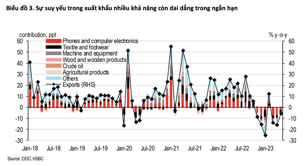 Trong khi xuất khẩu giảm 5,8% so với cùng kỳ năm trước, một mức giảm nhẹ hơn hẳn so với mức giảm hai con số tháng trước. Sự suy yếu trên diện rộng của xuất khẩu tiếp tục ảnh hưởng đến triển vọng tăng trưởng của Việt Nam khi không có ngành hàng nào trong số các ngành hàng chính như điện tử, máy móc, dệt may/da giày và đồ nội thất gỗ cho thấy dấu hiệu phục hồi đáng kể.