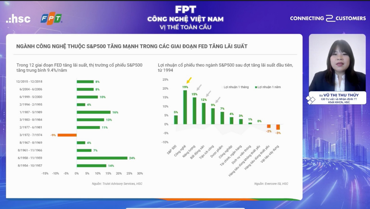 Chia sẻ trong buổi hội thảo trực tuyến C2C do Công ty cổ phần Chứng khoán HSC tổ chức có chủ đề “FPT: Công nghệ Việt Nam - Vị thế toàn cầu”, bà Vũ Thị Thu Thủy, Giám đốc thông tin và nhận định thị trường của HSC nhận định, các cổ phiếu công nghệ đầu ngành vẫn đang là mục tiêu đầu tư dài hạn của nhà đầu tư. Mỗi giai đoạn thị trường giảm lại là cơ hội để mua với giá hấp dẫn. Xu hướng này cũng diễn ra ở Việt Nam khi ngành khoa học công nghệ là động lực tăng trưởng kinh tế mới.