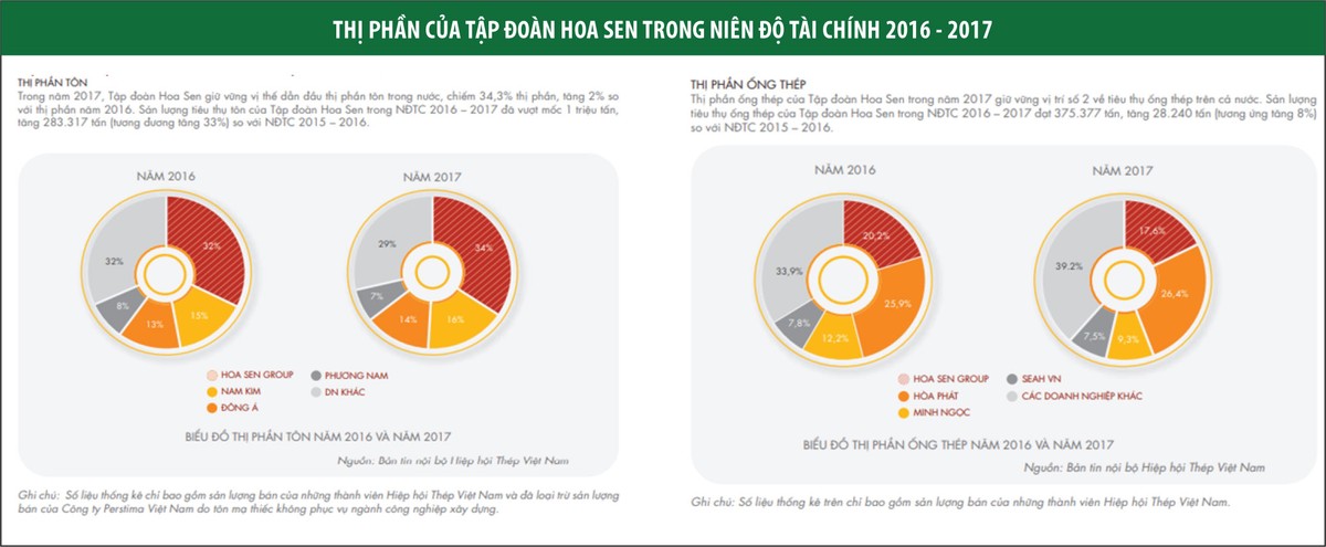 Trong biểu đồ thị phần các “ông lớn” trong ngành được HSG trình bày, dẫn số liệu từ Bản tin nội bộ Hiệp hội Thép Việt Nam, năm tài chính 2016-2017, thị phần của Hoa Sen tăng 2 điểm phần trăm, Nam Kim và Đông Á cùng tăng 1 điểm phần trăm, Phương Nam bị mất 1 điểm phần trăm, còn lại là các doanh nghiệp nhỏ lẻ khác bị giảm từ mức 32% về 29% thị phần.