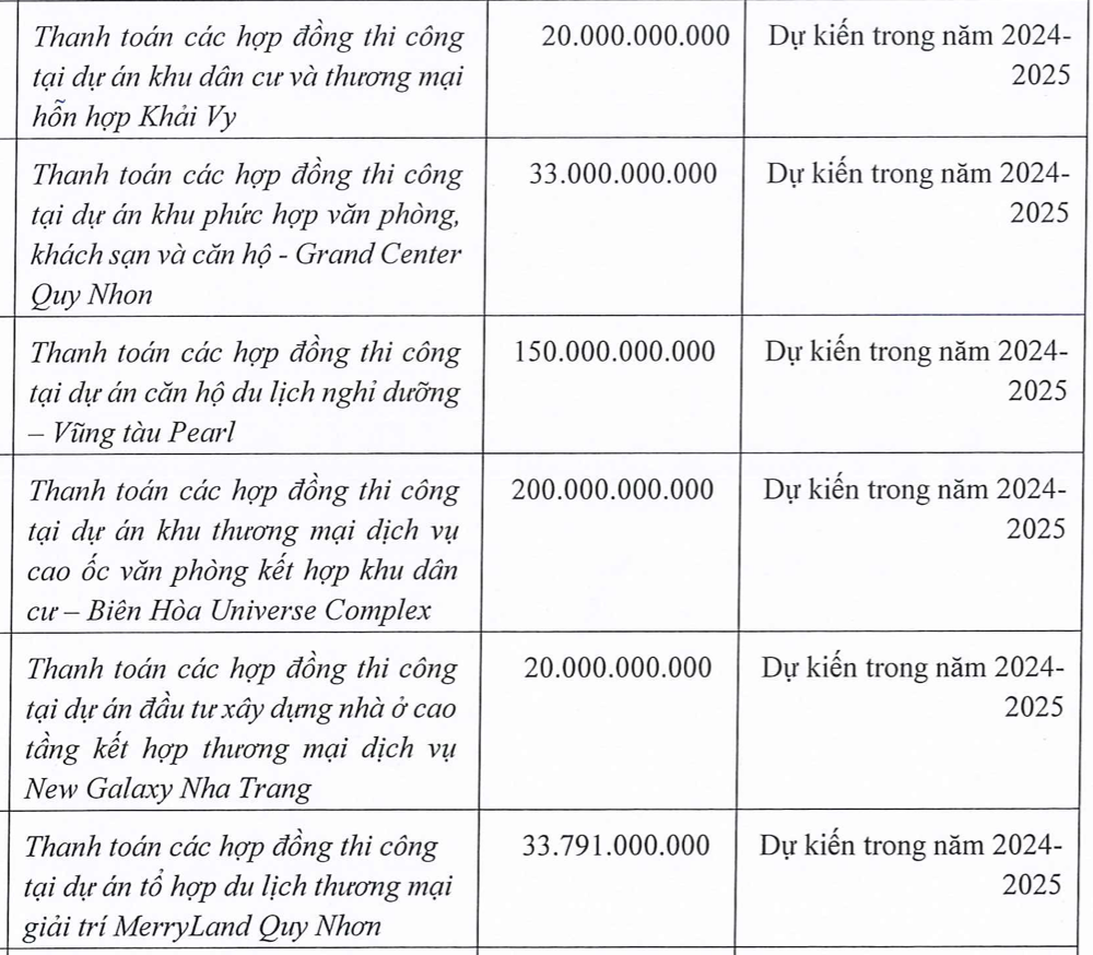 456,79 tỷ đồng còn lại, Hưng Thịnh Incons sẽ dùng để thanh toán các hợp đồng thi công xây dựng công trình của Công ty với các nhà thầu thi công thuộc các dự án. Cụ thể: