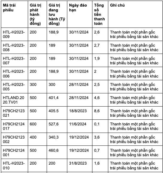 Công ty cổ phần Hưng Thịnh Land vừa công bố thanh toán gốc cho một loạt trái phiếu của Công ty, bao gồm HTL-H2023-009, HTL-H2023-008, HTL-H2023-007, HTL-H2023-006, HTL-H2023-005, HTLAND.2020.TV01, H79CH2123021, H79CH2124017, H79CH2123002, H79CH2124001, HTL-H2023-010.
