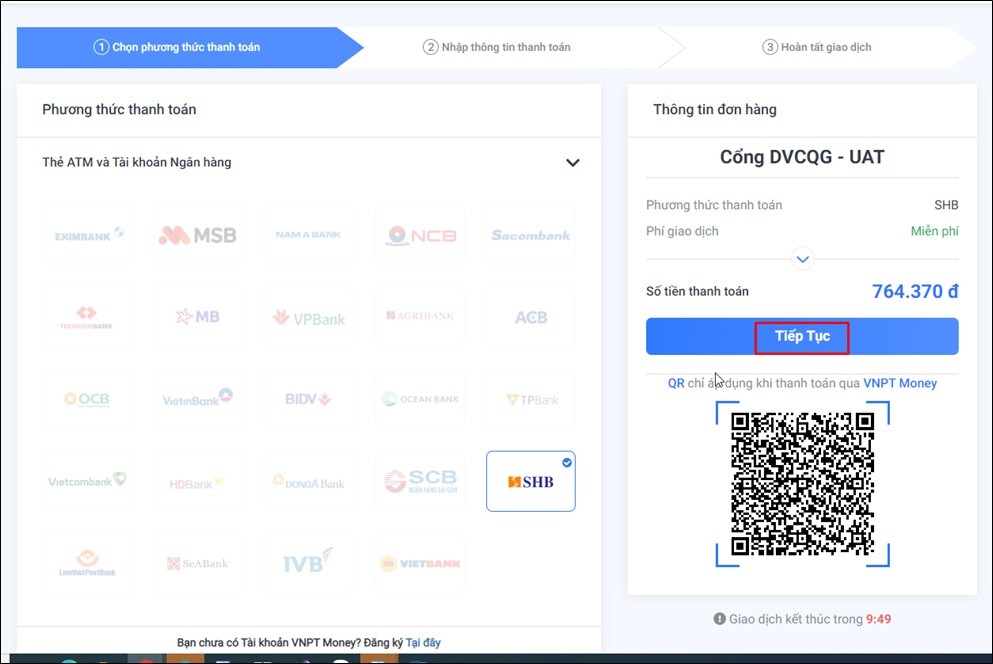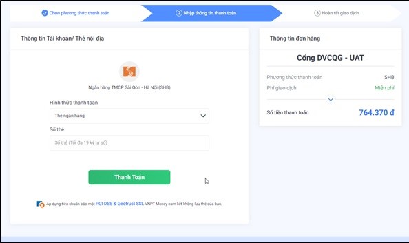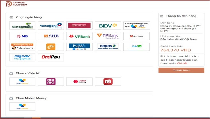 - Chọn "Thanh toán" để tiếp tục. Hệ thống sẽ điều hướng sang Nền tảng thanh toán quốc gia (Payment Platform) như hình dưới: