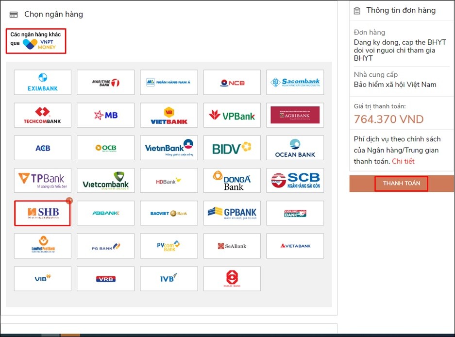 - Chọn ngân hàng hoặc trung gian thanh toán (nơi người tham gia đăng ký, đóng có tài khoản) để thực hiện thanh toán. Ví dụ: Chọn ngân hàng SHB qua trung gian thanh toán như màn hình sau: