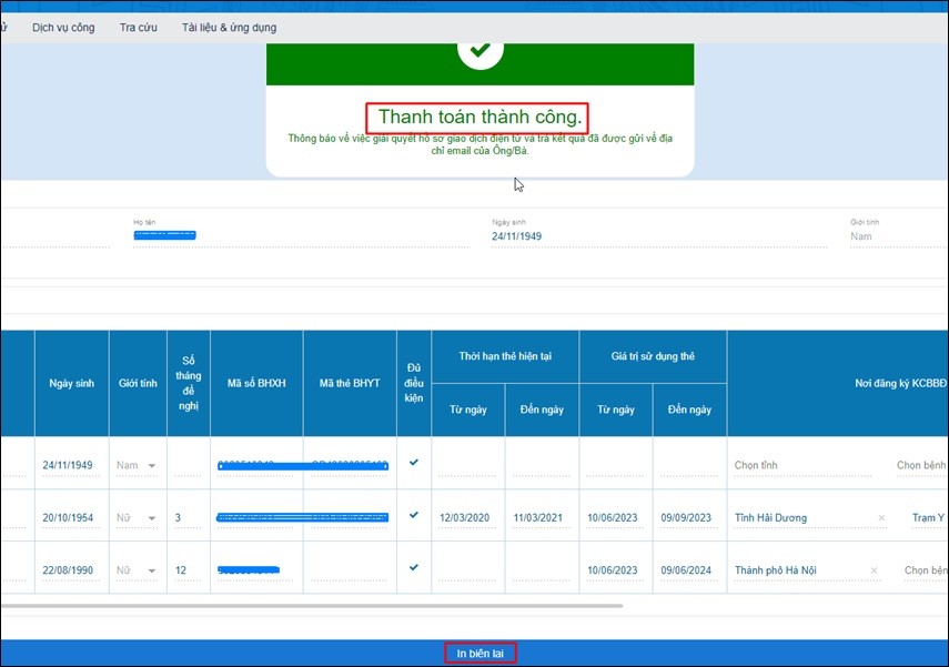 - Thanh toán thành công, hệ thống hiển thị như hình trên. Có thể chọn: "In biên lai" để xem biên lai thanh toán.