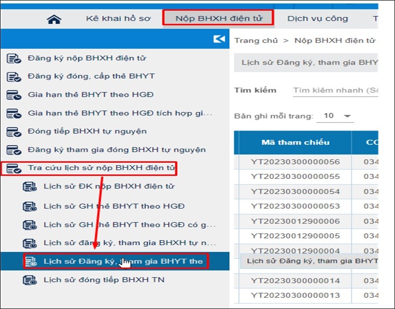 - Để xem lại lịch sử giao dịch, tại menu (bên trái), chọn "Tra cứu lịch sử nộp BHXH điện tử/Lịch sử đăng ký tham gia BHYT theo HGĐ"
