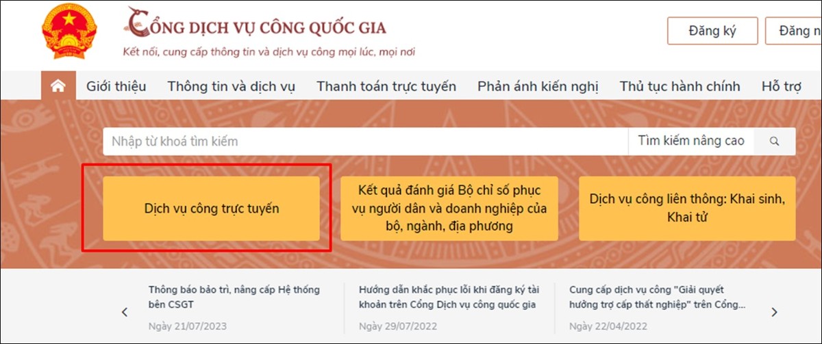 Bước 2. Tại trang chủ Cổng DVC quốc gia, chọn menu "Dịch vụ công trực tuyến".
