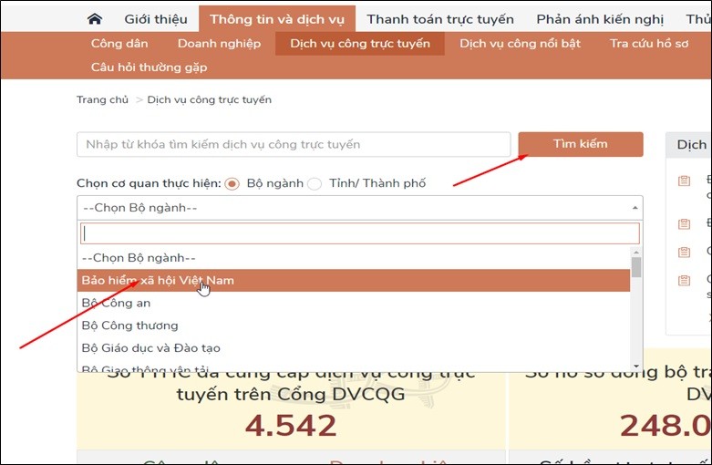Chọn cơ quan thực hiện là Bộ ngành và chọn Bảo hiểm xã hội Việt Nam, chọn Tìm kiếm: