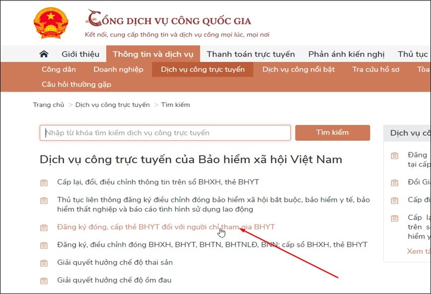 Bước 3. Chọn DVC: “Đăng ký đóng, cấp thẻ BHYT đối với người chỉ tham gia BHYT”.